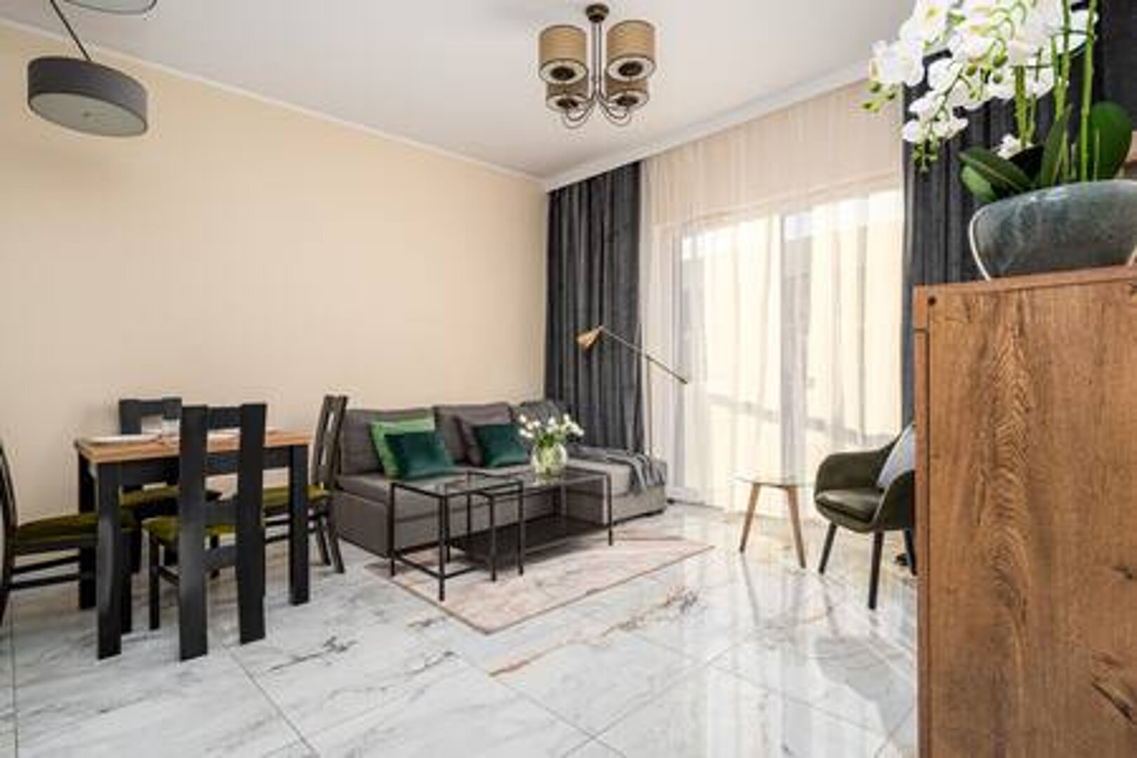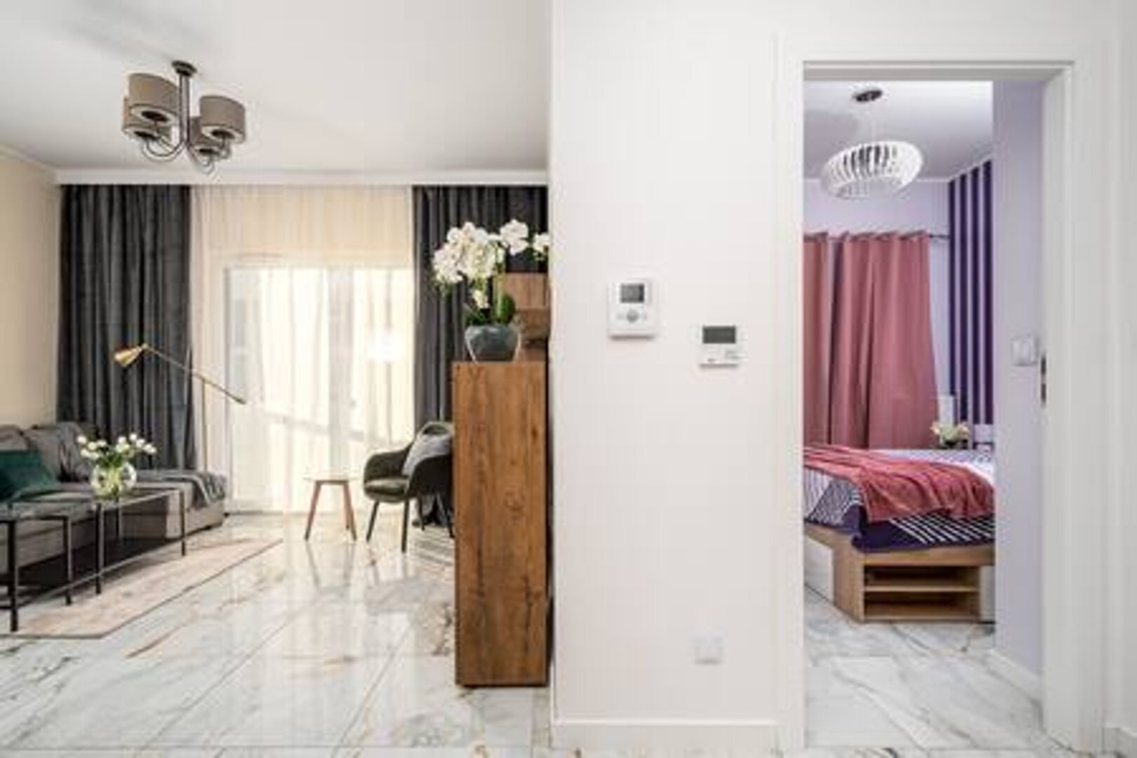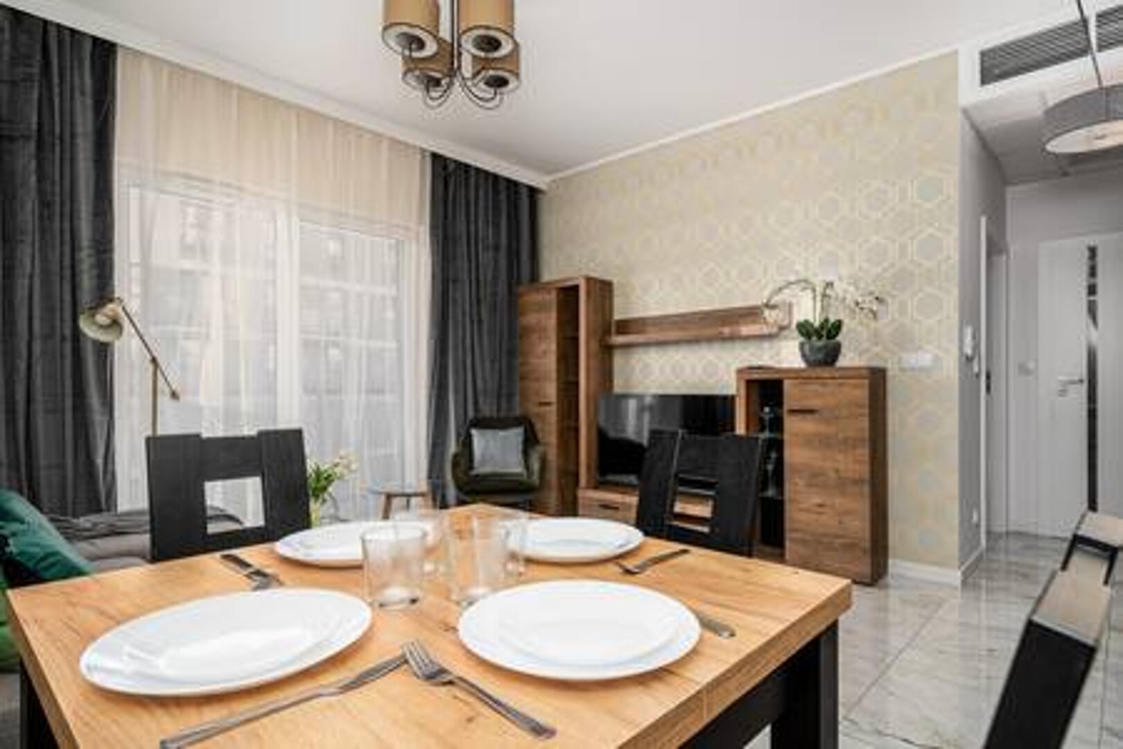 Miejsce idealne na wygodny pobyt. Stylowy apartament dla 4osób. Składa się z pokoju dziennego, kuchni wnęki sypialnianej łazienki, garderoby oraz balkonu.